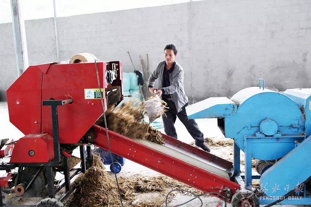 今年3月,四合庄村一直筹划的村集体公司——重庆市聚众饲料销售有限公司终于成立了,同时,公司旗下建成四合庄村秸秆回收综合利用加工厂,专门加工肉牛草料,赵天权也有了新身份——新公司的监事以及加工厂的负责人。在四合庄村秸秆回收综合利用加工厂,赵天权正在操作圆捆包膜一体机,将碾碎的秸秆打包。