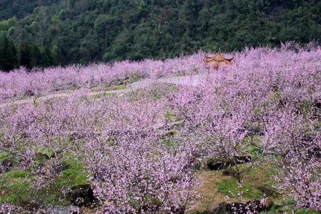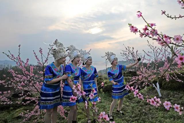桃花开游客来,游客在长生镇三合社区桃花林拍照留念。