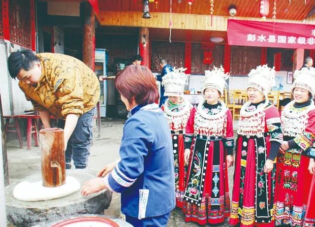 “阿哥打粑阿妹和,哟依哟,糍粑越打越是糯……”伴随着动听的歌声,不一会儿,香糯的糍粑就打好了。李大姐告诉记者,一说到过年,我们都会打糍粑。在过年里打糍粑,寄予着我们苗族人民的美好愿望,由于白白圆圆的糍粑意味着“团团聚圆”,象征着一家人团团圆圆,寄予团团聚圆过新年之愿望。磨豆腐、煮汤圆、打糍粑,这是苗家人过年的三道主菜。下午三点多,一家人不用明确分工,就将一道道菜摆上了桌子。大家或坐在桌上,或围在炕头,品尝着年的味道,团圆温馨弥漫在整个农家小屋。“一道腊排骨炖萝卜,一个腊肉炒菜,还有自家做的豆腐。”李大姐说,每年过年都是这些菜,其实对于现在的生活,我们每天都当过年。过年主要是大家能够一起团团圆圆,大家有空坐下来叙叙旧,拉下家常。如今,彭水积聚了大量的优质旅游资源,不管是自然风光、还是人文风情,都有丰富的旅游资源。各乡镇结合自身实际,发挥资源优势,发展特色乡村旅游。鞍子镇依托鞍子苗寨,打造的集观苗族村落、品苗族文化习俗、赏苗乡风光于一体的特色民族风情旅游景区,让老百姓在家办起农家乐,给村民带来更多收益的同时,还能带动周边村组的农产品销售。