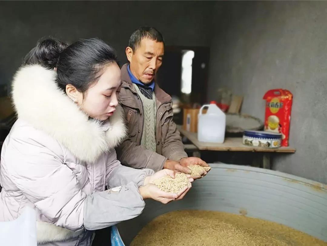 李姗娜(左)在农户家收购稻谷。(受访者供图)