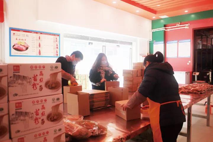 县网货中心工作人员在打包发货。