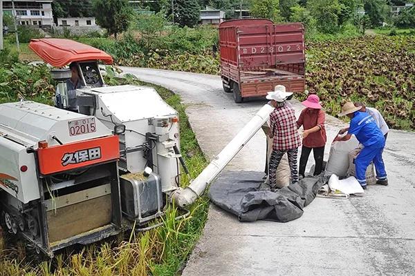 彭水苗乡供销为农服务队下乡收割稻谷。
