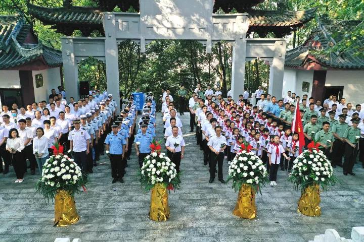 县委书记石强,县委副书记、代理县长陈清松,县人大常委会主任彭玉萍,县政协主席谢胜等县领导,退役军人代表,县级各部门主要负责人,公安干警、消防指战员、武警官兵代表,师生代表共230余人来到东门坡烈士陵园,排着整齐的队列,面向革命烈士纪念碑肃立,表达对革命先烈的缅怀敬仰之情。