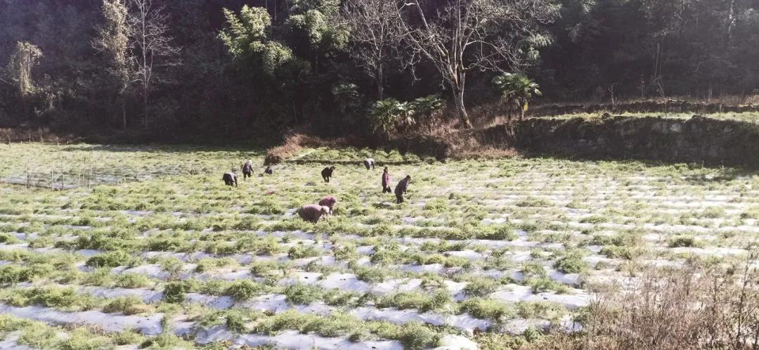 1月23日,长坪村9组中药材基地里,村民三五成群,或除草、或施肥,正忙着管护中药材。