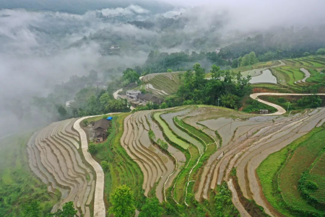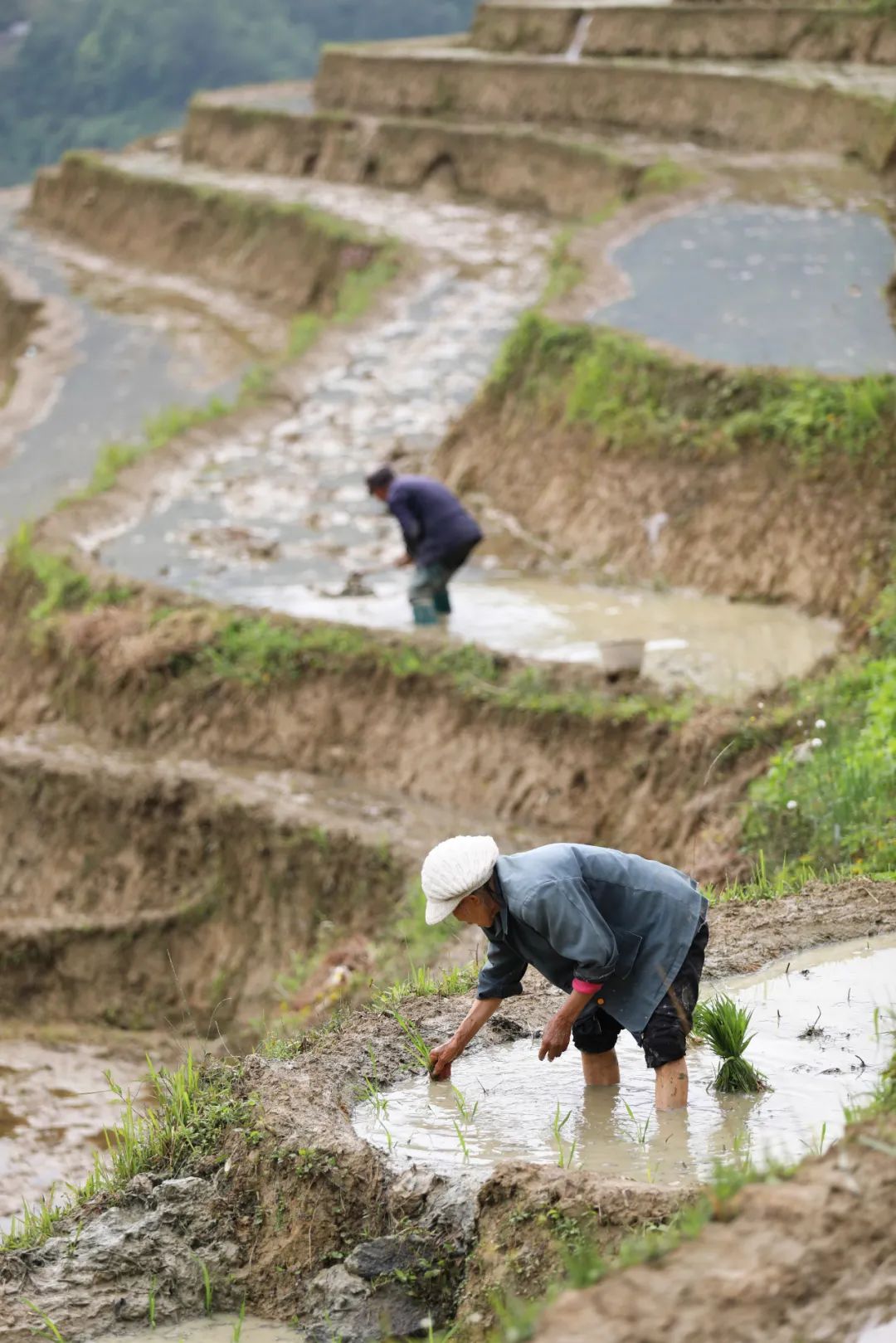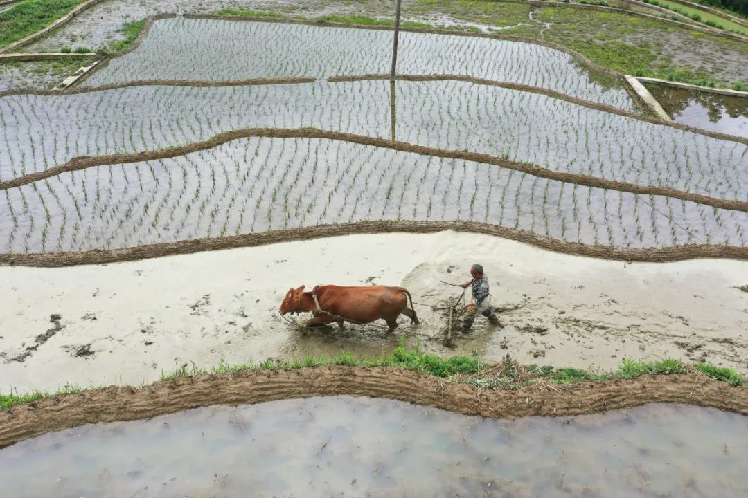5月20日,在润溪乡麻池村,晨雾笼罩下的层层梯田美如画卷,村民们忙碌在田间,或插秧、或耙田、或提田埂,为粮食丰收打下坚实的基础。