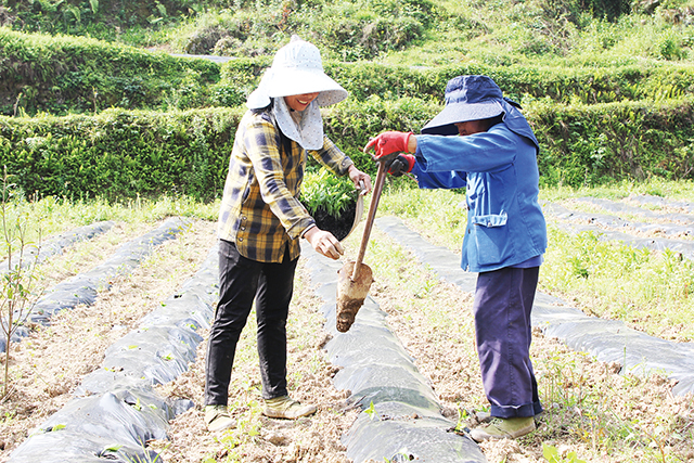 村民正在移栽辣椒。
