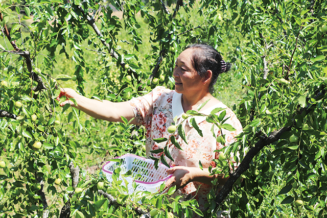 “我就是这附近的村民,平时农闲时节在这里干点活,80元一天,主要负责剪枝、施肥、锄草等。自己的土地也在这基地入股了,一年下来收入还是可以,在家门口就能赚钱,我们大家都还是比较满意。”说起果园带给自己的收益,当地居民曾庆菊乐呵呵地介绍。