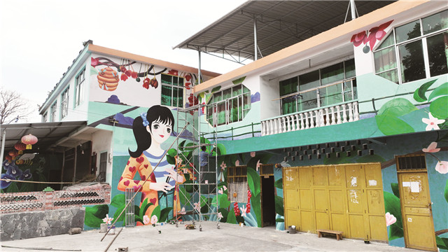 文武社区5组组长卫华万说:“原来这些墙基本上就是光粉刷,有的还没有粉刷,现在是涂料刮了两次,后面再绘画,上漆,搞出来完全是个美丽的乡村,大家对做出来的效果很是满意。”
