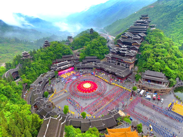 蚩尤九黎城,是国家4A级旅游景区,拥有中国最大的苗族建筑群落,涵盖九道门、九黎宫、九黎部落、苗王府、三苗长廊、蚩尤大殿、九黎神柱等,其中九黎神柱是目前世界上高度最高、直径最大的苗族图腾柱;九黎宫是世界最高最大的吊脚楼建筑体。景区内有非物质文化遗产朗溪竹板桥造纸技艺、苗族蜡染、苗族刻纸、庹氏苗银锻造技艺等展示,可让游客体验博大精深的民族文化。同时,景区还有丰富多彩的演出活动,包括竹竿舞、踩花山等互动性演出及室内实景剧《苗祖·蚩尤》演出。