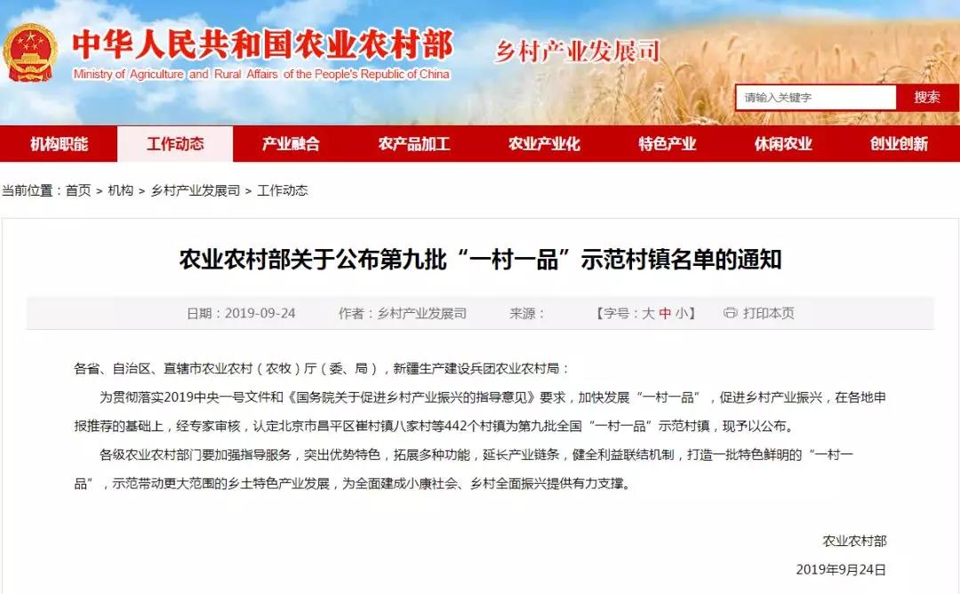 2019-10-15 09:42:11好消息! 近日,国家农业农村部公布 第九批“一村一品”示范村镇名单 彭水郁山镇光荣上榜! 近日,农业农村部公布了第九批“一村一品”示范村镇名单,认定北京市昌平区崔村镇八家村等442个村镇为第九批全国“一村一品”示范村镇,其中包含彭水郁山镇钟鼓村。
