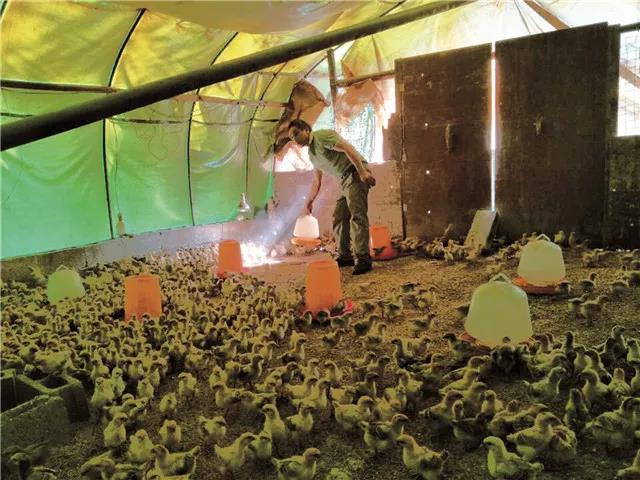 笔者跟着胡云江走进鸡舍,只见地上摆放着白色和黄色圆柱形状的塑料桶,按照功能严格进行区分,黄色桶是喝水用的,白色的是用来装玉米粒。胡云江介绍,刚孵出的小鸡崽温度保持在33℃,每隔一周可以降温2℃,四周后就顺其自然适应室外温度即可。